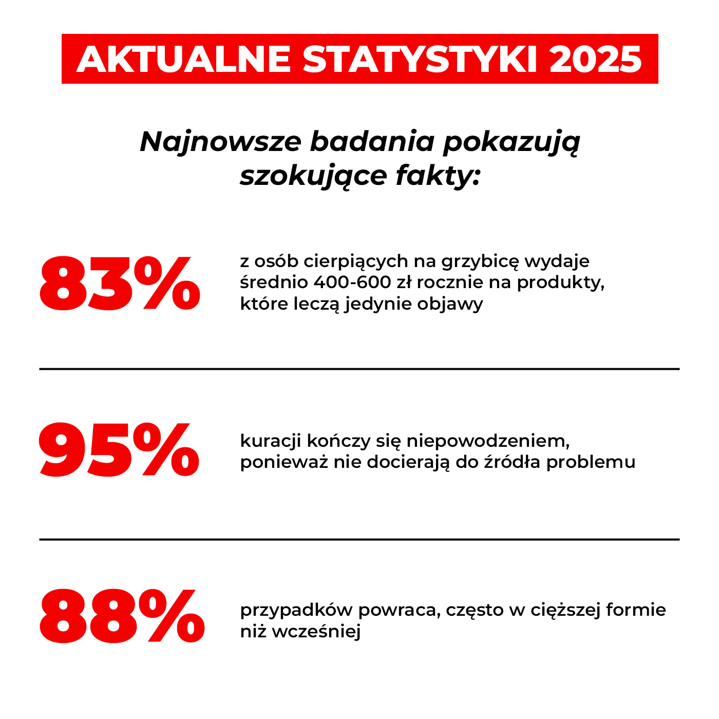 83% osób chorych na grzybicę wydaje średnio 200–300 EUR rocznie na produkty leczące wyłącznie objawy. 95% metod leczenia jest nieskutecznych, ponieważ nie docierają do źródła problemu. 88% przypadków powraca, często w cięższej postaci niż wcześniej.