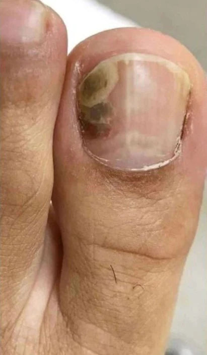 2. Grzybica głęboka: wnika pod paznokieć i powoduje jego pogrubienie i deformację.