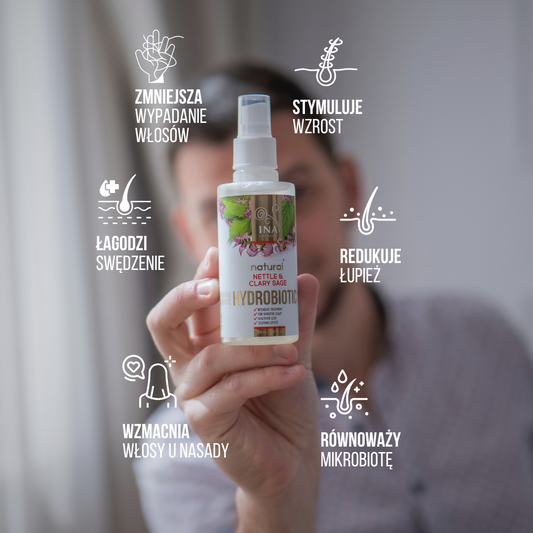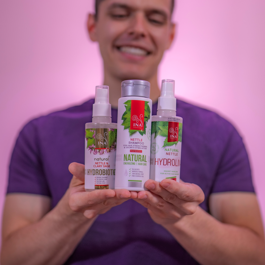 Naturalny szampon pokrzywowy firmy InaEssentials rewitalizuje włosy od nasady aż po same końce i zapobiega ich wypadaniu.