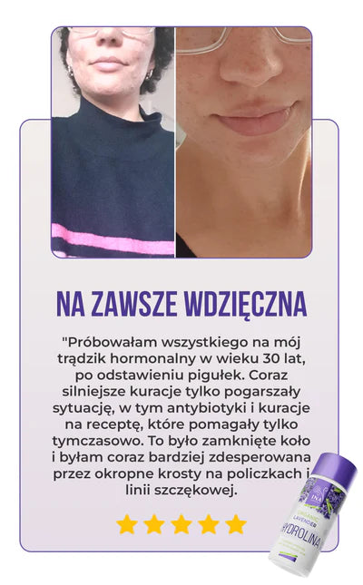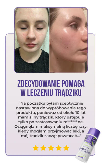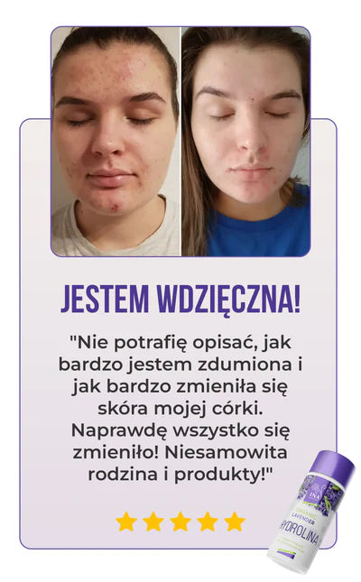 Lawendowa Hydrolina (150ml) to nie tylko ładna butelka; jest przebadana dermatologicznie. Z imponującym wynikiem zadowolonych klientów, wynoszącym ponad 90%, nasz produkt wykazuje skuteczność w zmniejszaniu trądziku, zaskórników i poprawie zdrowia skóry. Kliknij, aby wyświetlić szczegóły certyfikatu.