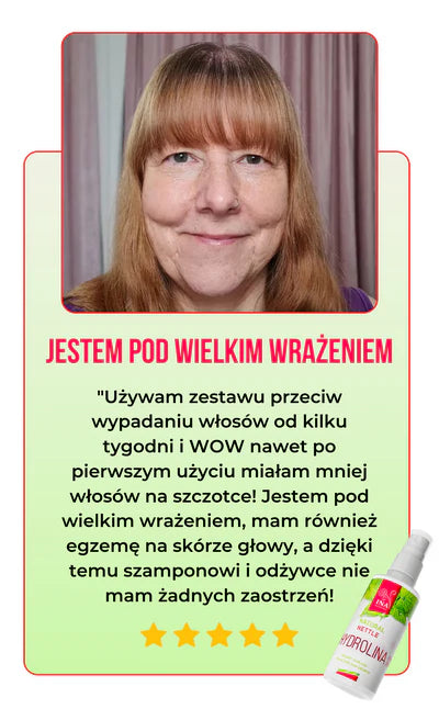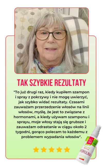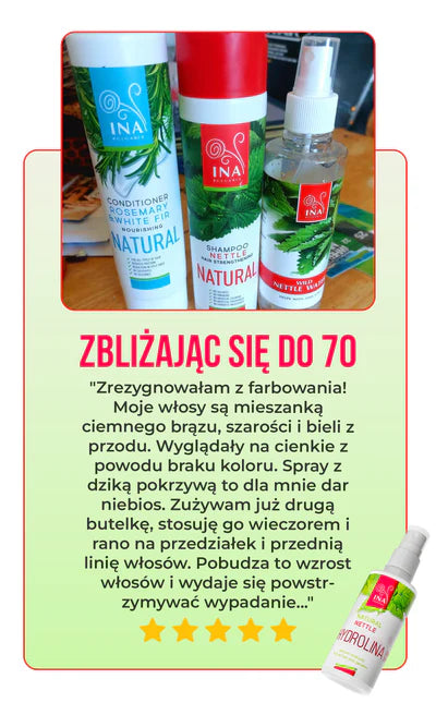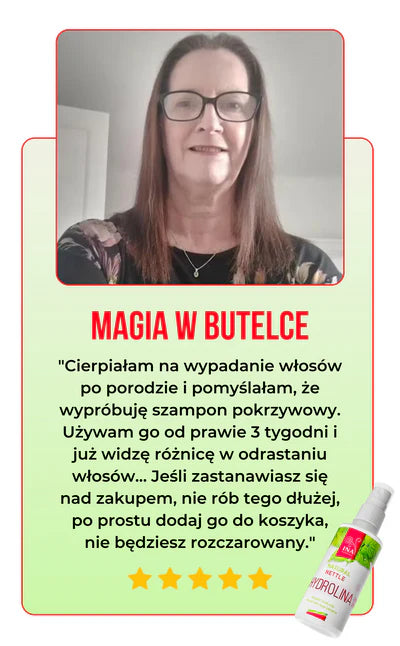 Hydrolina z Pokrzywy (150ml) to coś więcej niż tylko wspaniała butelka, to prawdziwe opinie klientów. Dzięki imponującemu wynikowi satysfakcji klientów wynoszącemu ponad 90%, nasz produkt pokazuje swoją siłę w walce z wypadaniem włosów i przetłuszczaniem się włosów, jednocześnie poprawiając ogólny stan zdrowia włosów. Nie wierz nam na słowo, przeczytaj historie naszych klientów.